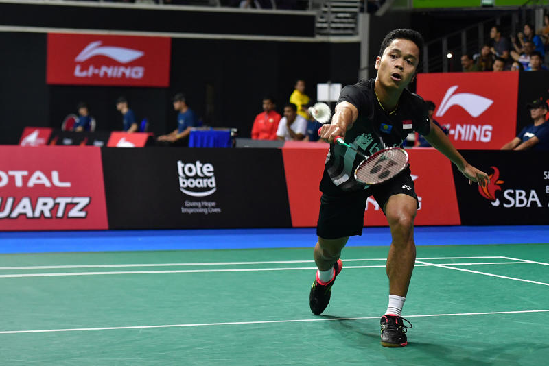 SINGAPORE - Indonesia's Anthony Sinisuka Ginting delivered the first major upset of the Singapore Badminton Open when he defeated China's Olympic champion Chen Long 21-8, 21-19 in their men's singles quarter-final on Friday (April 12).