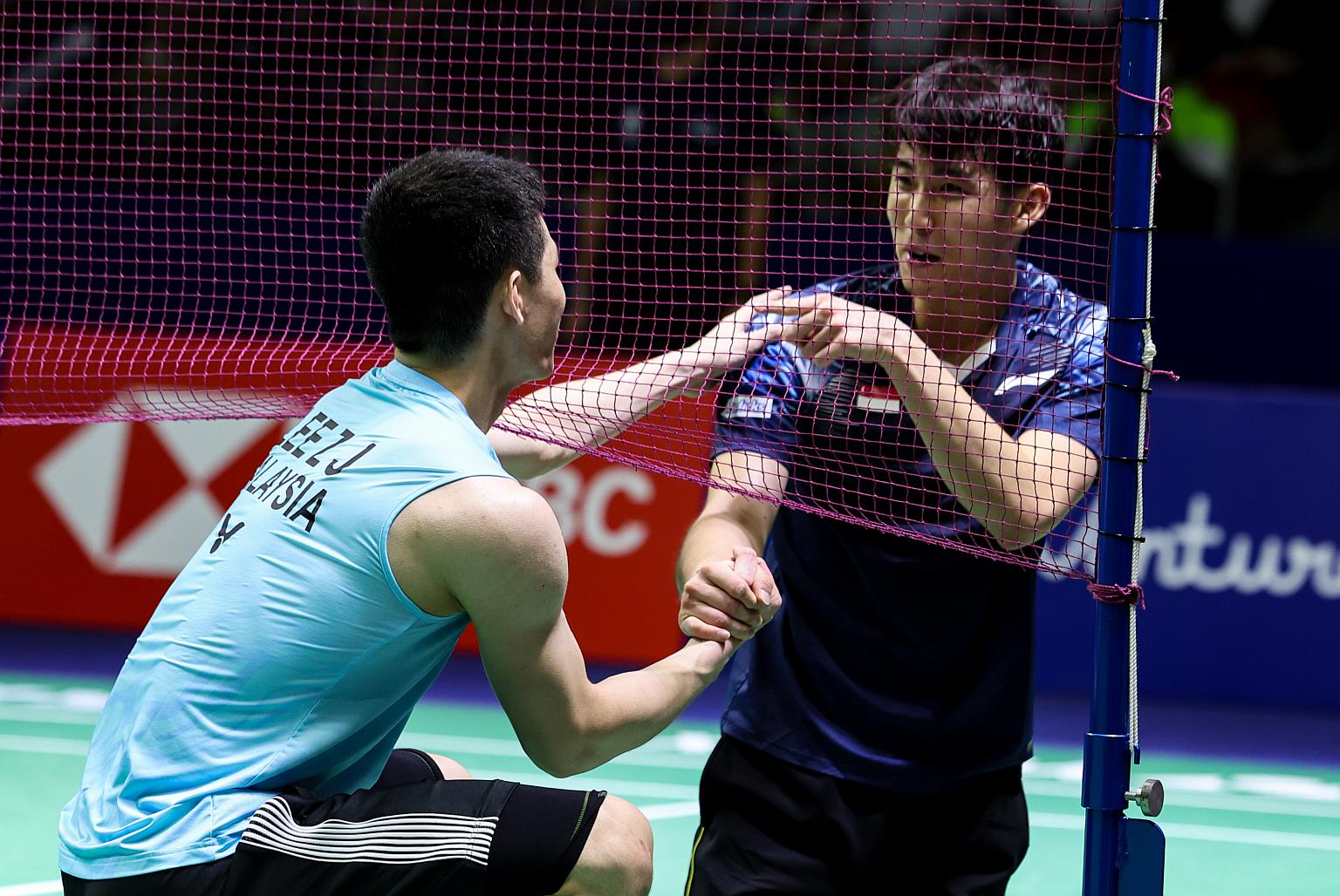 Loh Kean Yew (right) congratulating Malaysia's Lee Zii Jia after his Indonesia Open quarter-final loss in Jakarta on June 17, 2022.