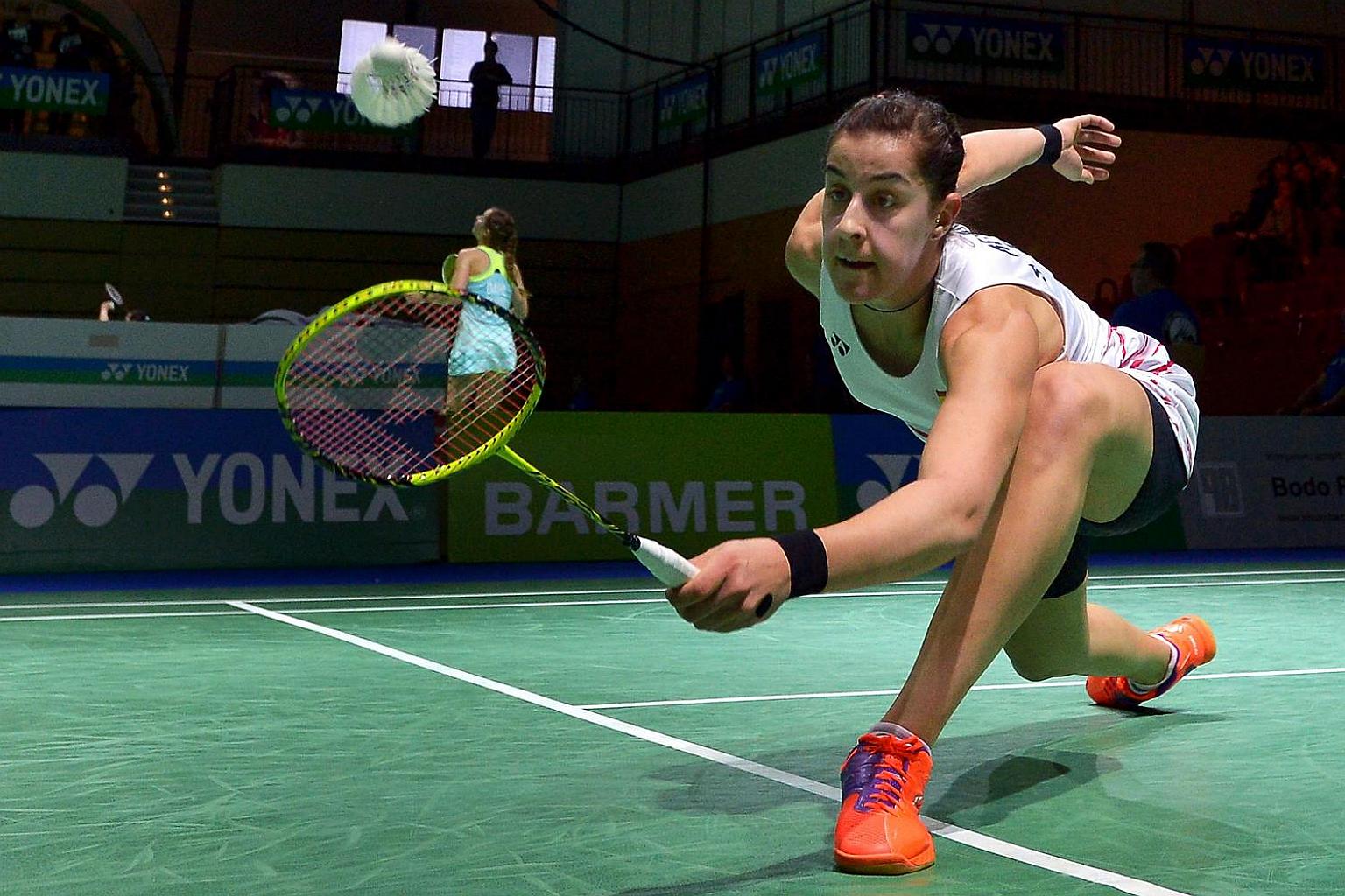 Carolina Marin of Spain in action against Line Kjaersfeldt of Denmark during their women's first round match of the Yonex German Open 2017 badminton tournament in Muelheim Ruhr, Germany.