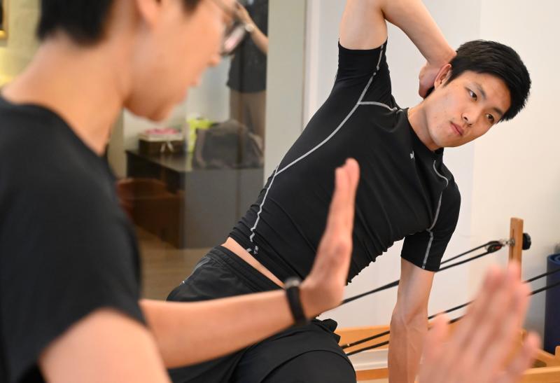Badminton player Chou Tien-chen of Taiwan takes part in a pilates class in Taipei, on Aug 30, 2019.