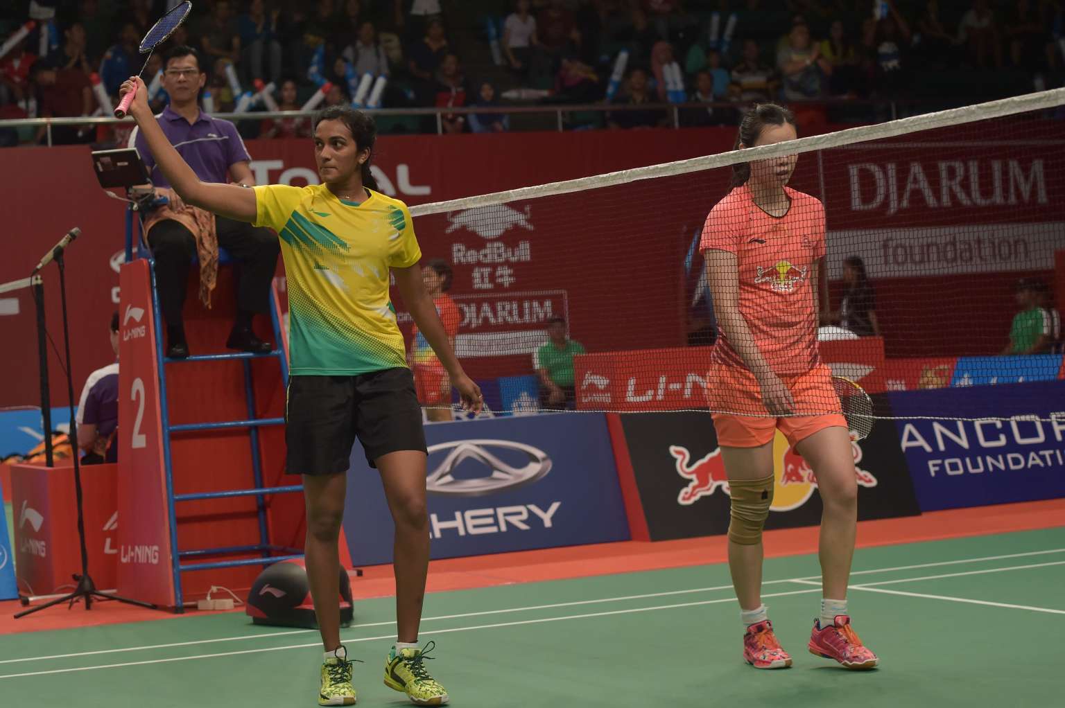 P.V. Sindhu (left) of India celebrates after defeating Li Xuerui of China in their women's singles match at the 2015 World Championships badminton tournament in Jakarta on Aug 13, 2015.