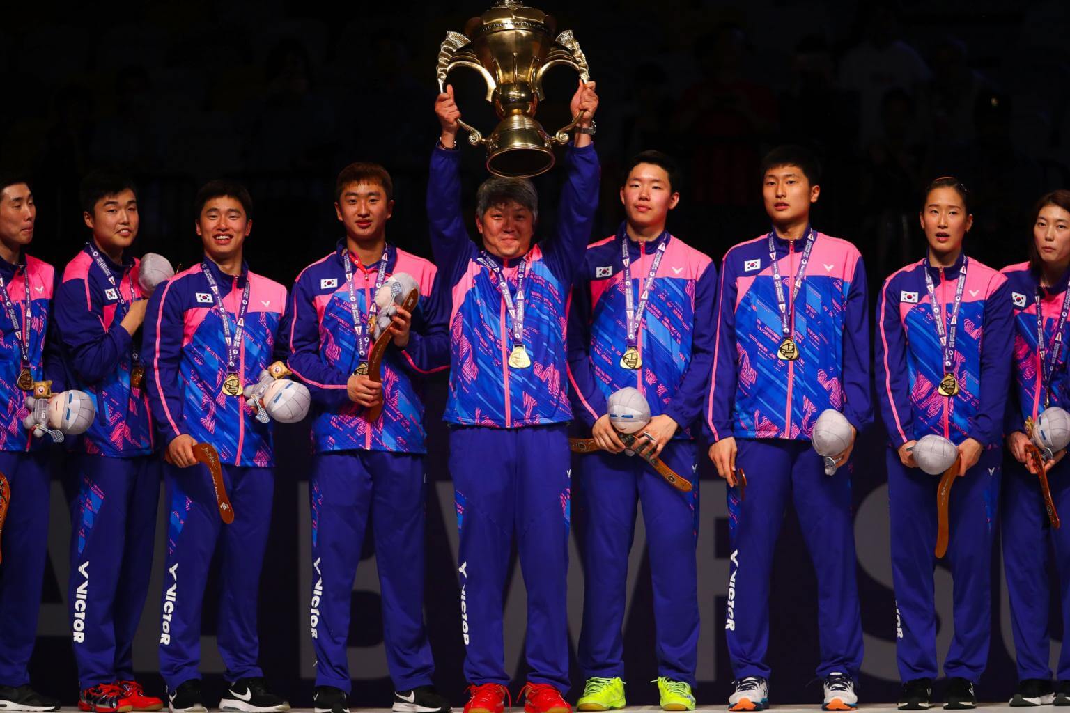 The South Korean team celebrating their victory at the Sudirman Cup in Gold Coast, Australia on May 28.