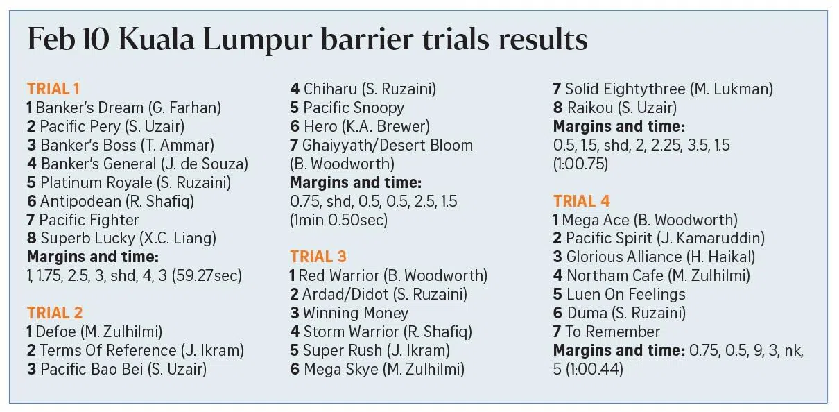 It was speed and front-running tactics at the trials which took place at the Selangor Turf Club on the morning of Feb 10.