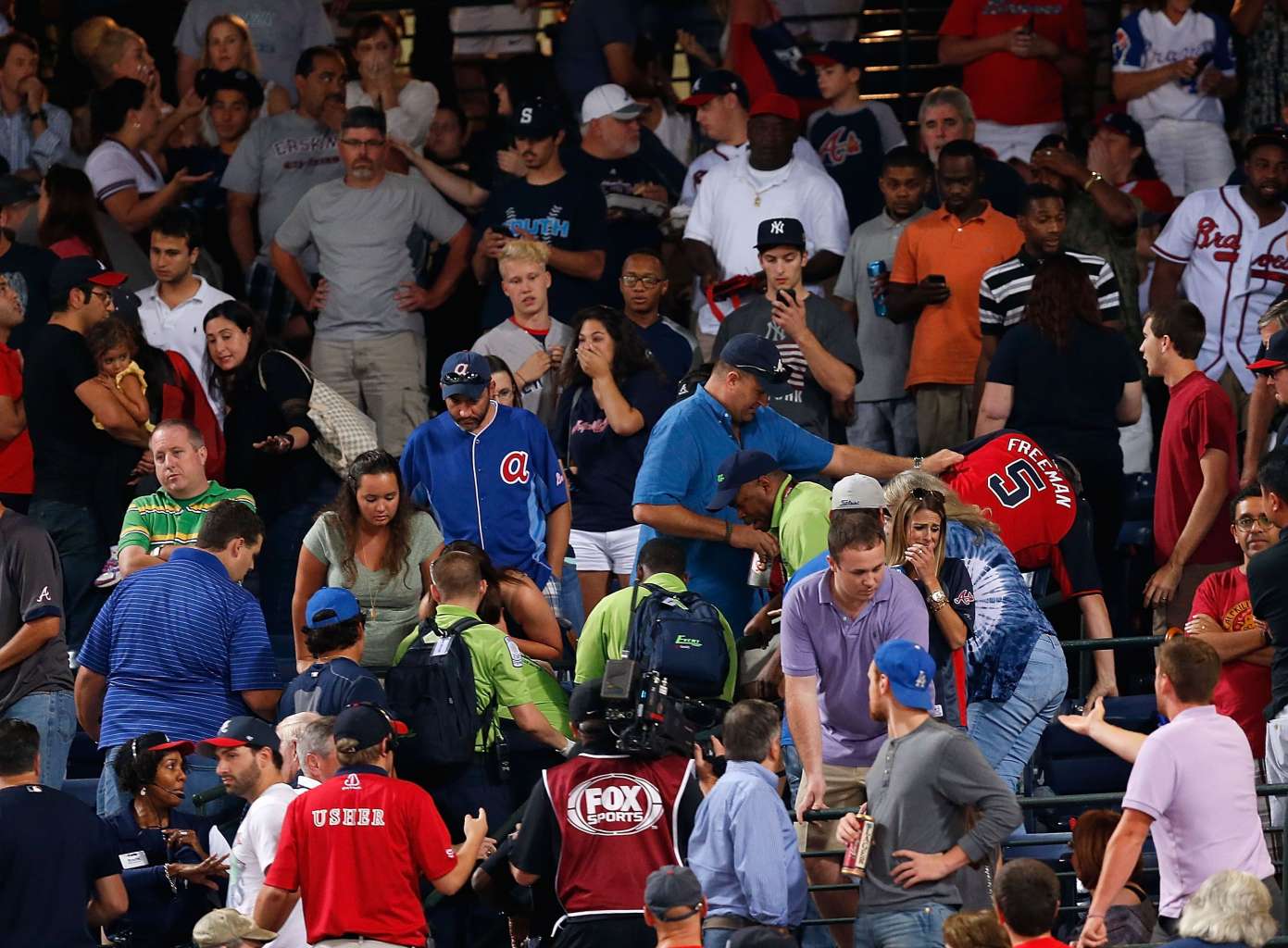 Emergency medical staff help attempt to help a fan that fell from the upper deck of Turner Field during the game between the Atlanta Braves and the New York Yankees on Saturday in Atlanta, Georgia. The fall proved fatal.