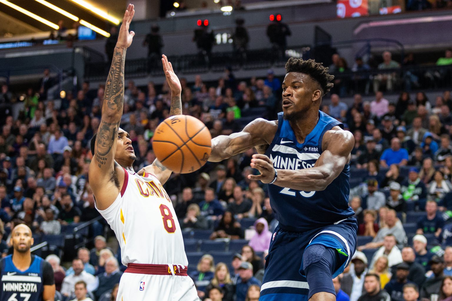 Minnesota Timberwolves' forward Jimmy Butler passes the ball against Cleveland Cavaliers' guard Jordan Clarkson during the fourth quarter at Target Centre on Oct 26, 2018.