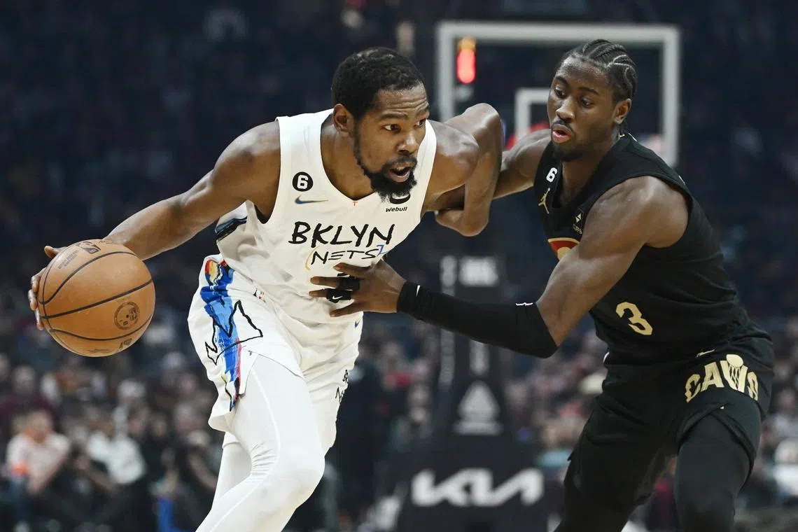 Brooklyn Nets forward Kevin Durant (left) drives to the basket against Cleveland Cavaliers guard Caris LeVert.