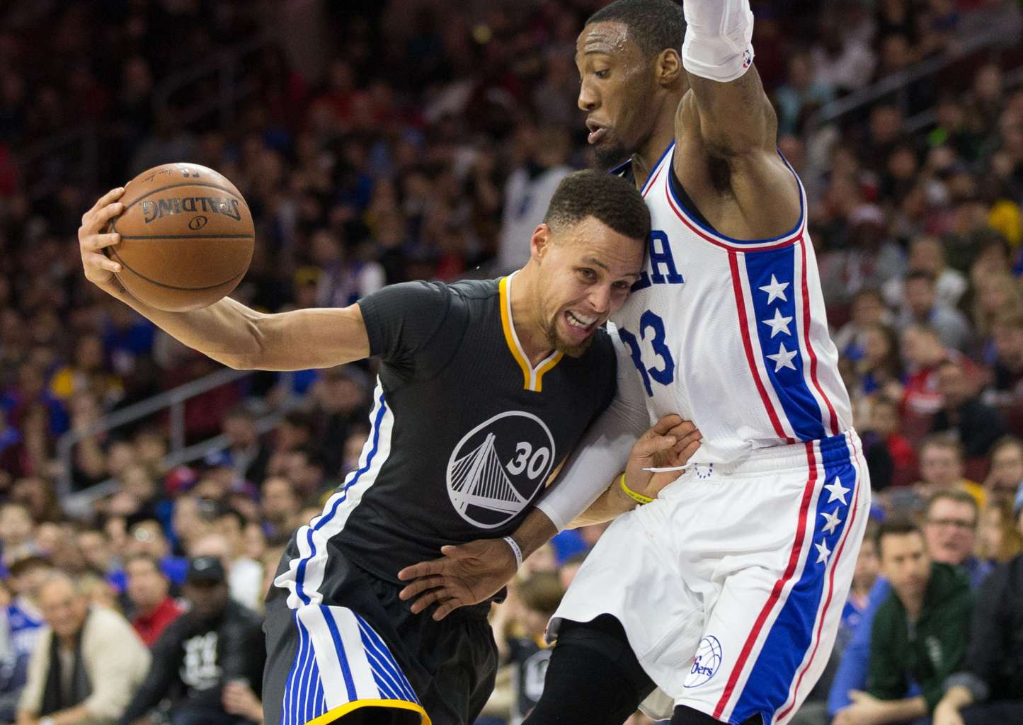 Golden State Warriors guard Stephen Curry (30) runs into trouble against Philadelphia 76ers forward Robert Covington (33) in Philadelphia.