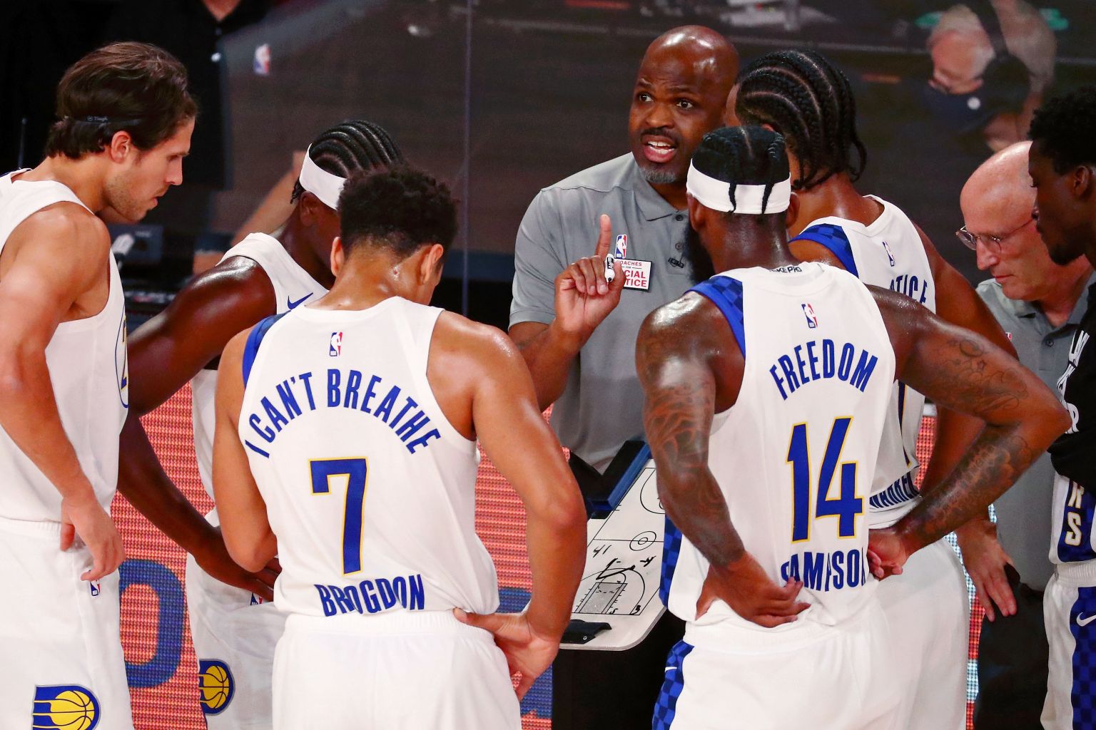 McMillan talks with his team during a time out against the Miami Heat on Aug 22, 2020.