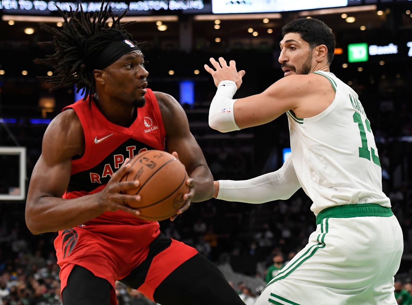 Boston Celtics centre Enes Kanter (right) playing in an NBA pre-season game on Oct 9, 2021.