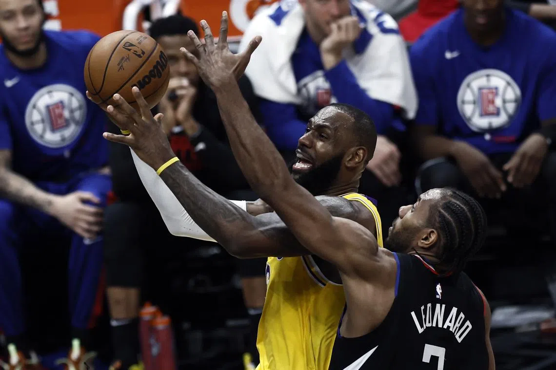 Los Angeles Lakers forward LeBron James (left) being guarded by LA Clippers forward Kawhi Leonard during the fourth quarter of their NBA game on April 5, 2023.