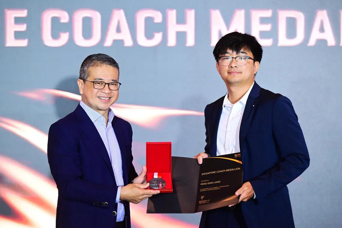 Mr Pang Qing Liang (right), National Youth Archery and Para Archery coach, receiving the Singapore Coach Medallion from Mr Edwin Tong, Minister for Culture, Community, and Youth, at the International Council for Coaching Excellence Global Coach Conference 2023 on Nov 30.