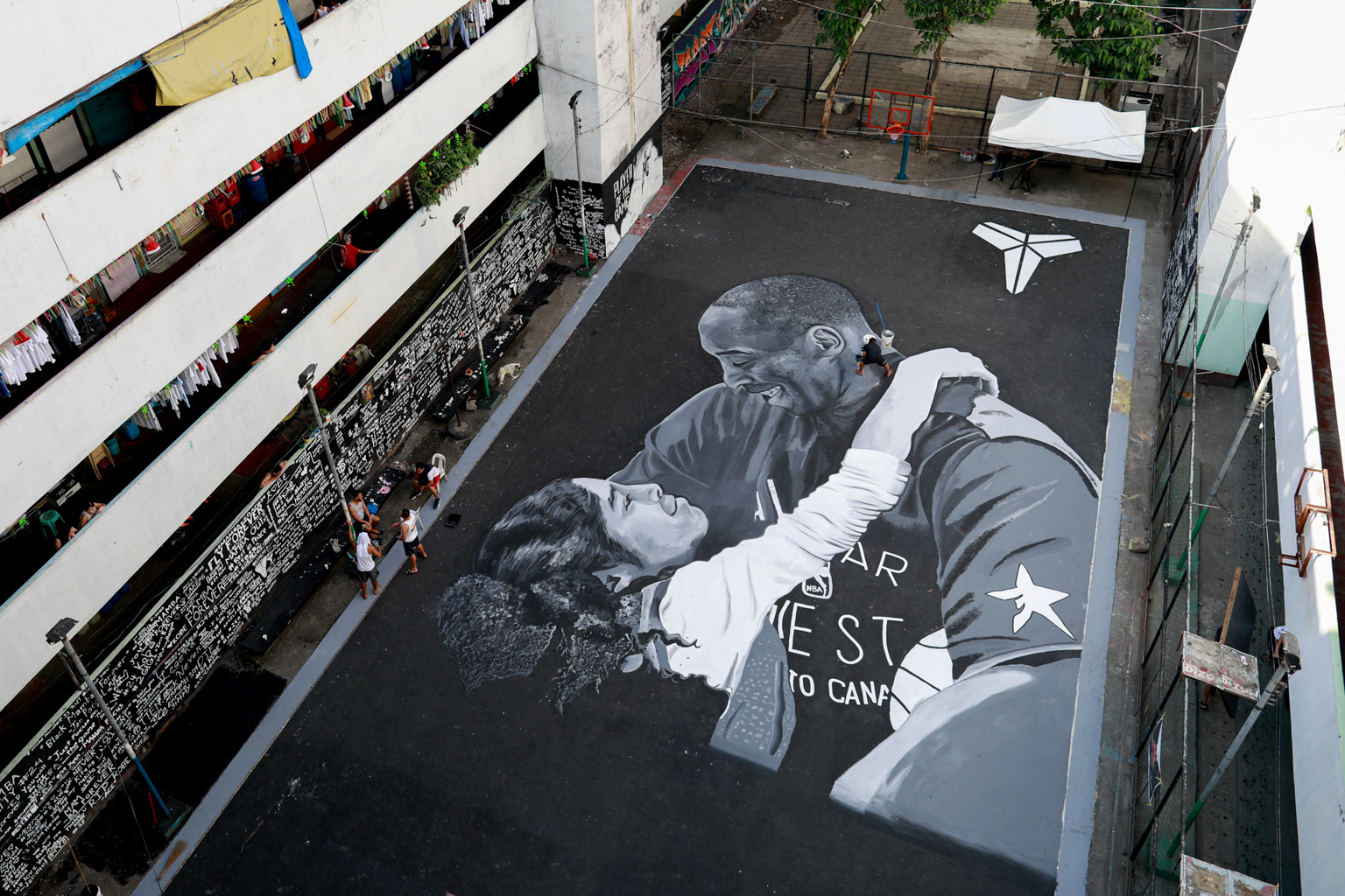 A man polishing a mural of Kobe Bryant and his daughter Gianna, which was painted soon after their deaths, on a basketball court of a housing block in Taguig City in Metro Manila yesterday. Basketball fans around the world have been mourning the demise of the NBA great.