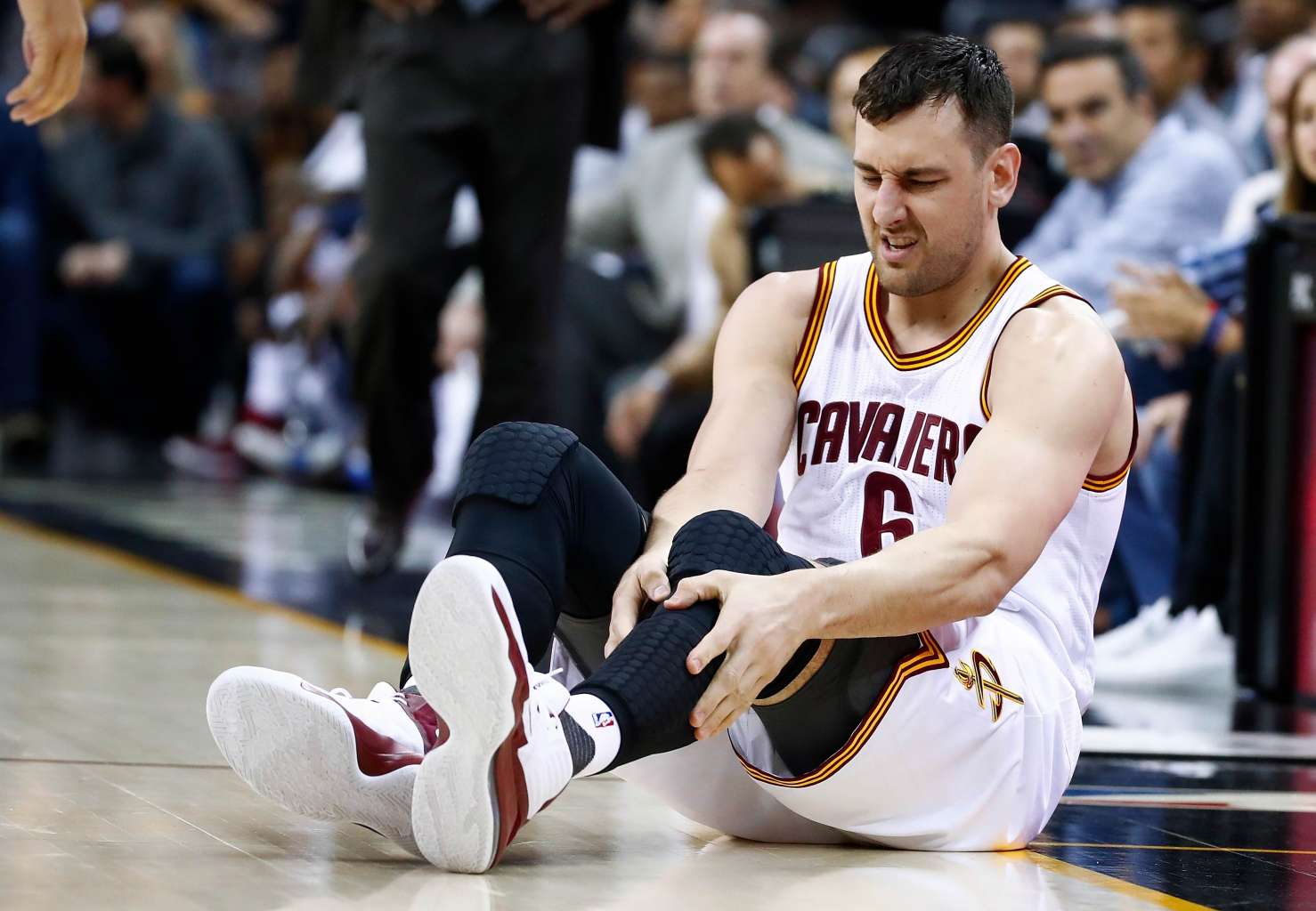 Cleveland Cavaliers centre Andrew Bogut grabbing his leg after injuring it during the NBA match against the Miami Heat on March 6, 2017.