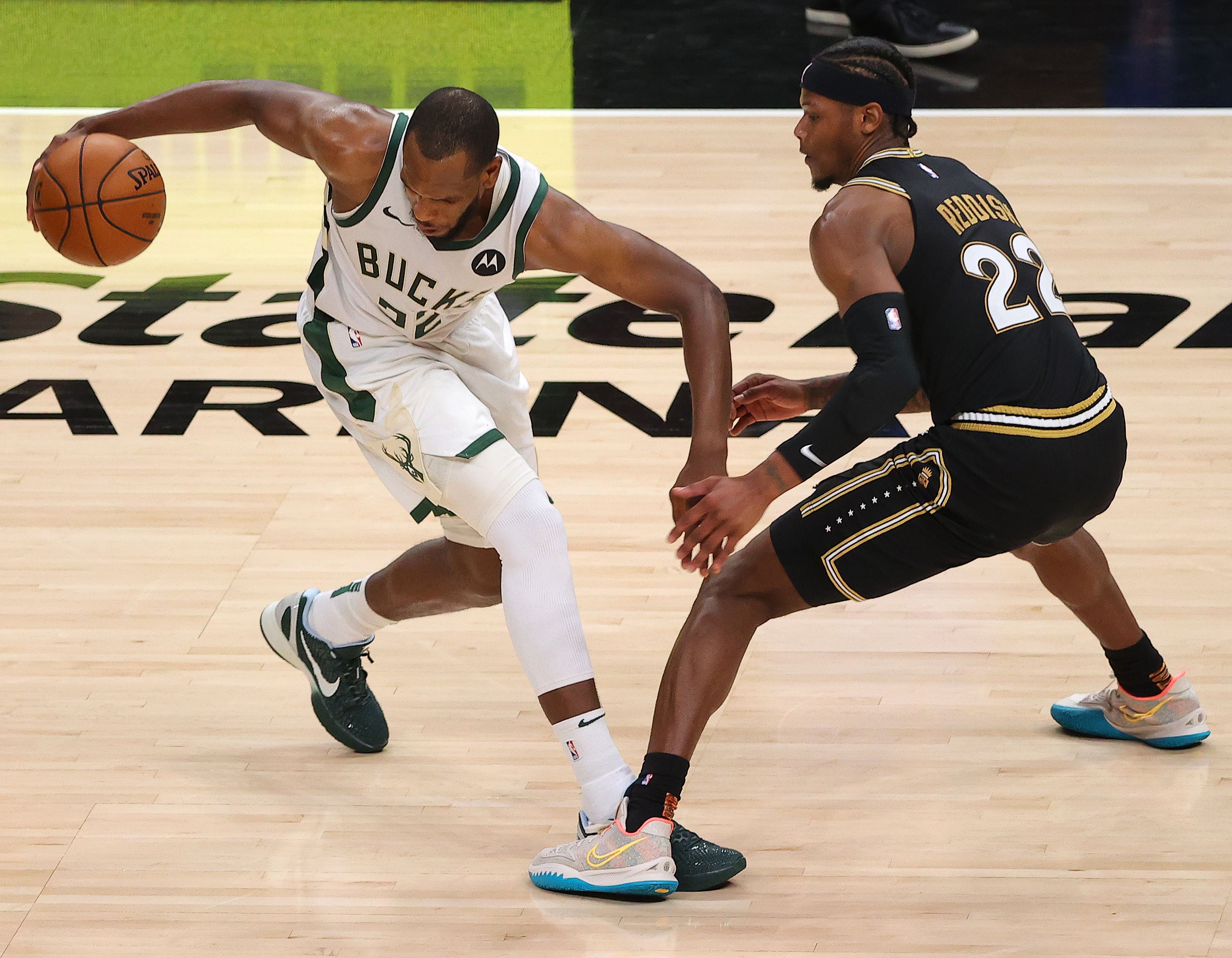 Khris Middleton (left) and Cam Reddish during Game Six of the Eastern Conference Finals at State Farm Arena, Atlanta, on July 3, 2021.
