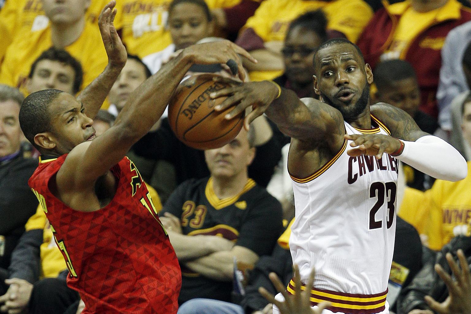 Atlanta Hawks forward Al Horford (left) defends as LeBron James of the Cleveland Cavaliers passes the ball.