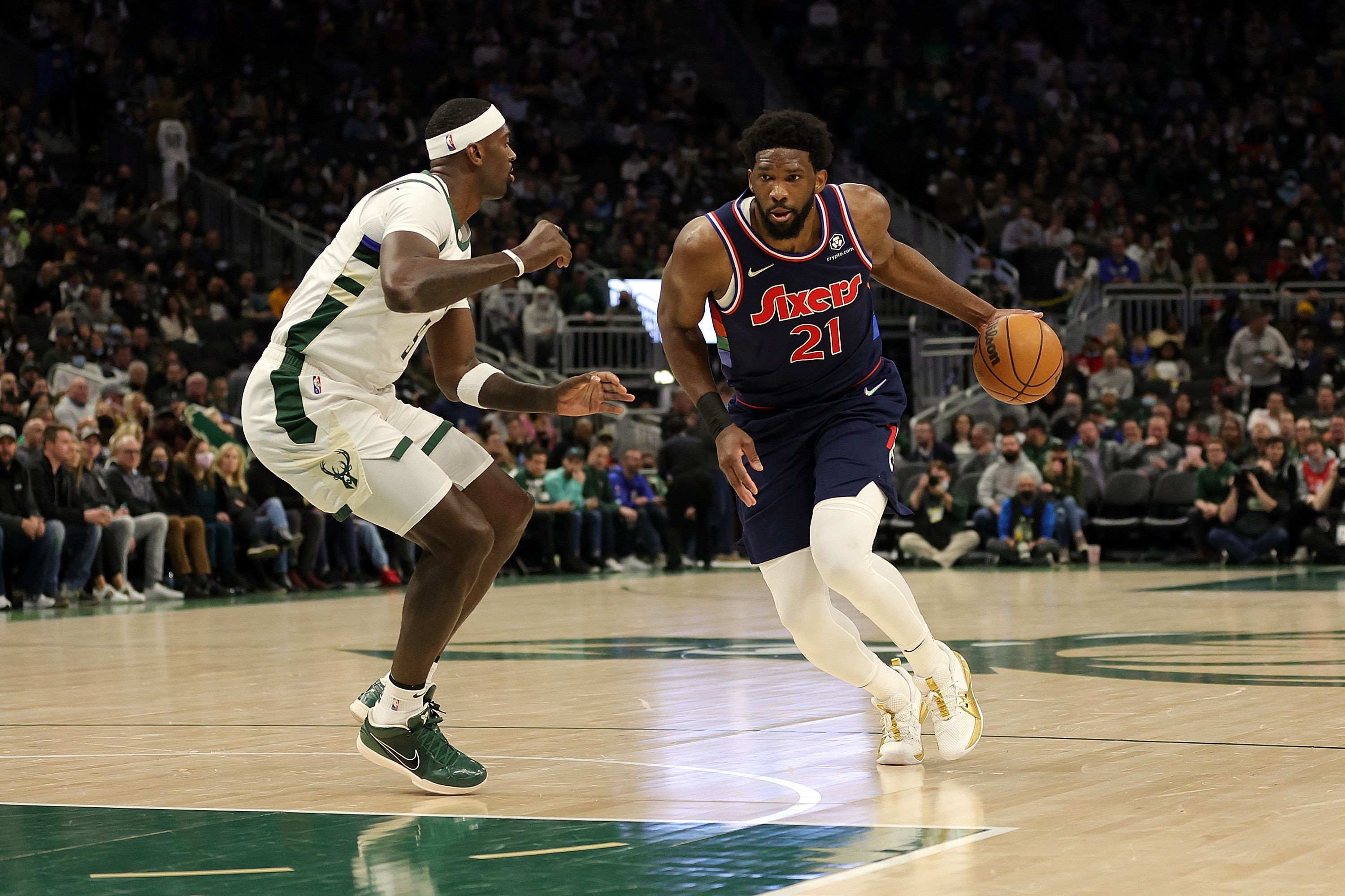 Joel Embiid (right) is defended by Bobby Portis during the second half of the game in Wisconsin on Feb 17, 2022.