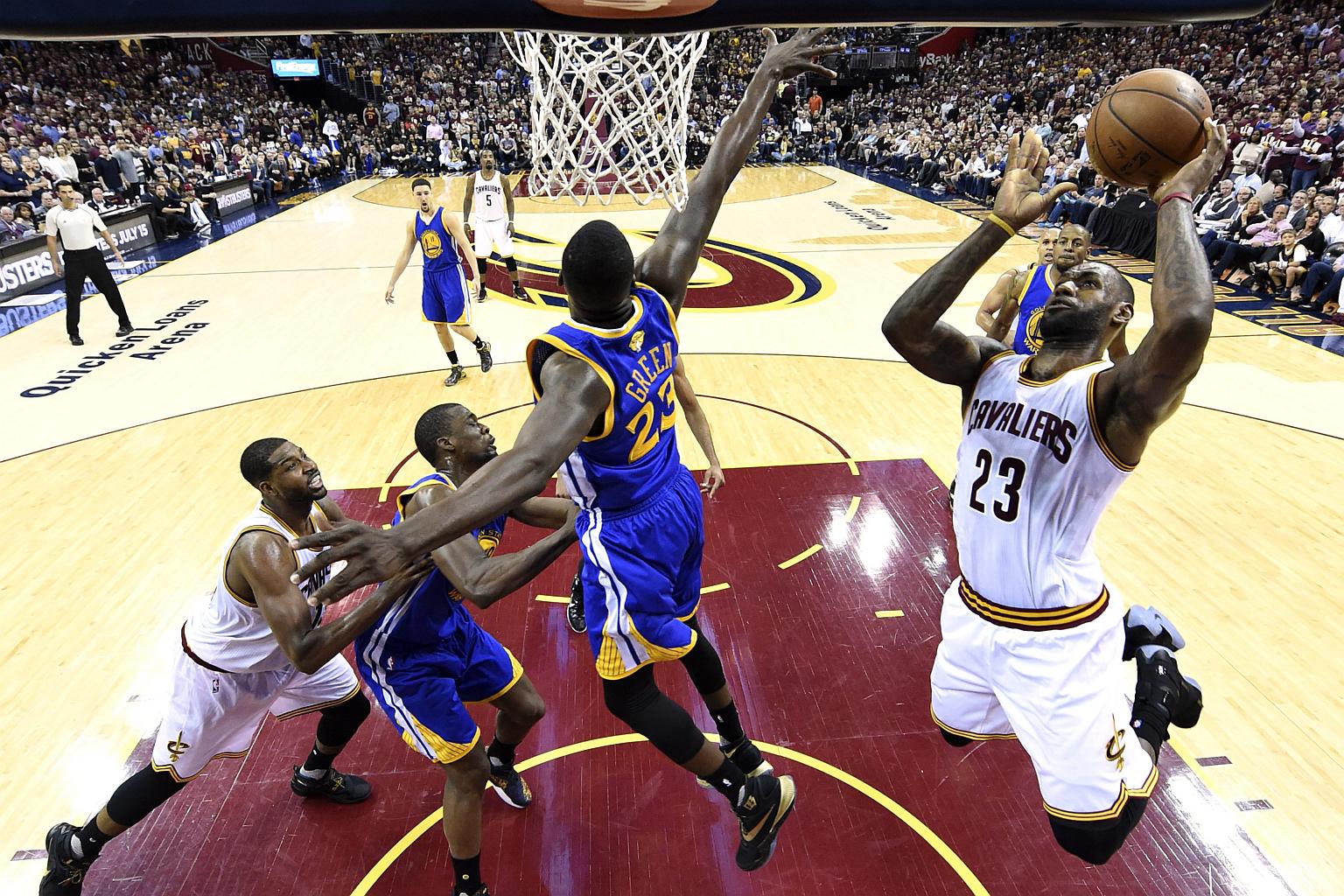 Cleveland Cavaliers forward LeBron James (right) goes for the basket as Golden State Warriors forward Draymond Green (centre) defends.