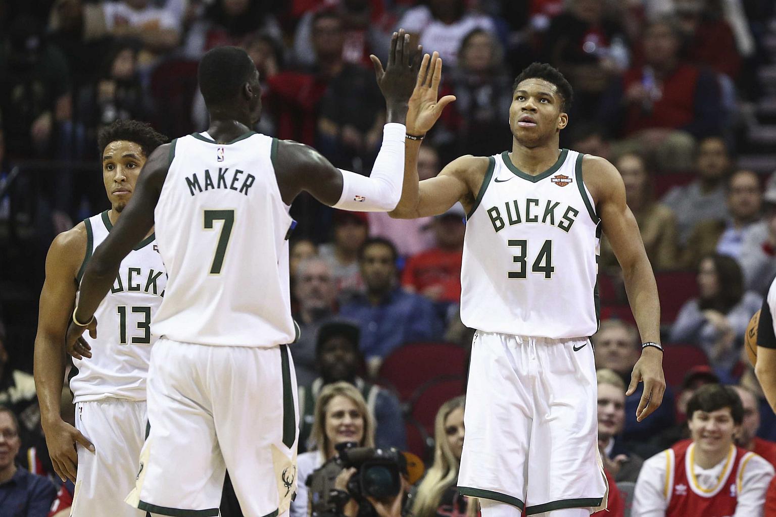 Milwaukee Bucks forward Giannis Antetokounmpo celebrates with center Thon Maker after a play during the first quarter against the Houston Rockets at Toyota Center.