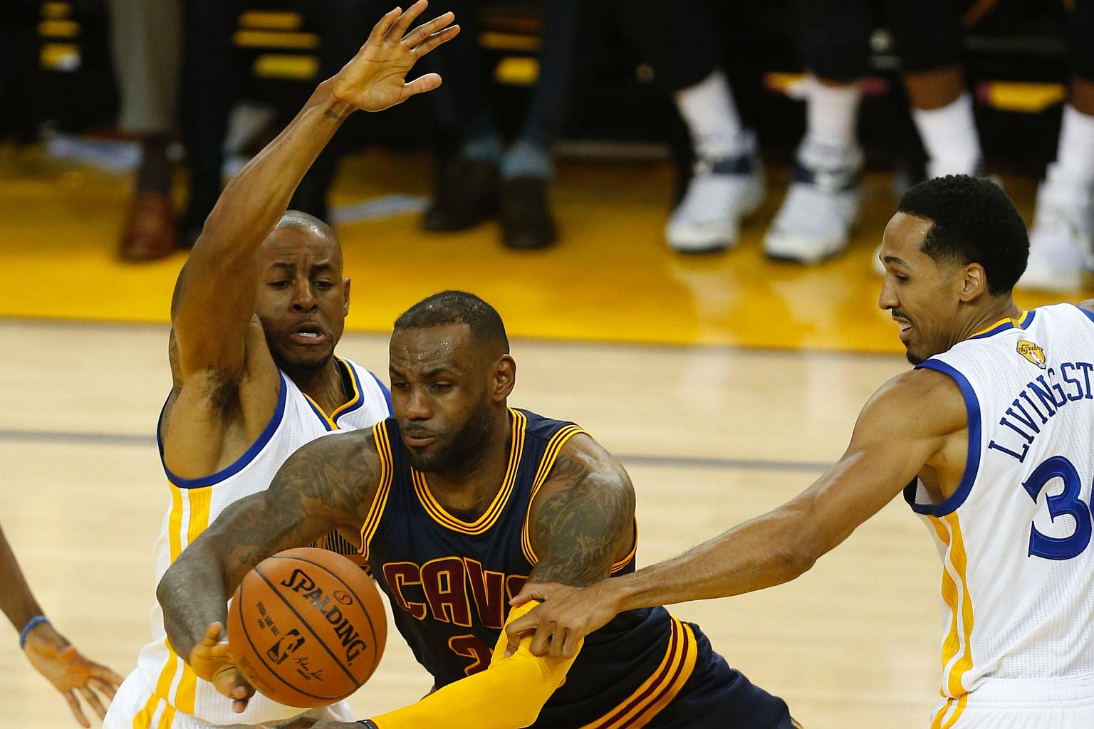 Cleveland Cavaliers forward LeBron James (centre) struggles with the rebound between Golden State Warriors forward Andre Iguodala (left) and guard Shaun Livingston.
