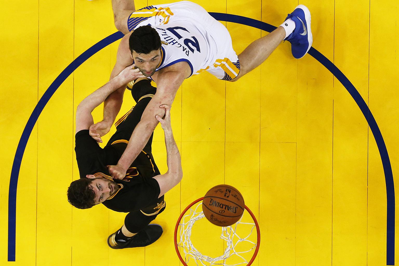 Golden State Warriors player Zaza Pachulia (R) goes for rebound against Cleveland Cavaliers player Kevin Love (L) in game two of the NBA Finals basketball game at Oracle Arena in Oakland, California, USA, 04 June 2017.