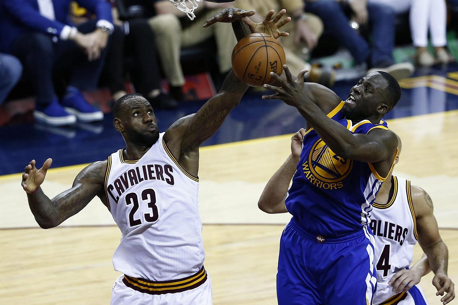 LeBron James (left) goes for a rebound against Golden State Warriors player Draymond Green during the second half of the NBA Finals basketball game four between the Golden State Warriors and the Cleveland Cavaliers.