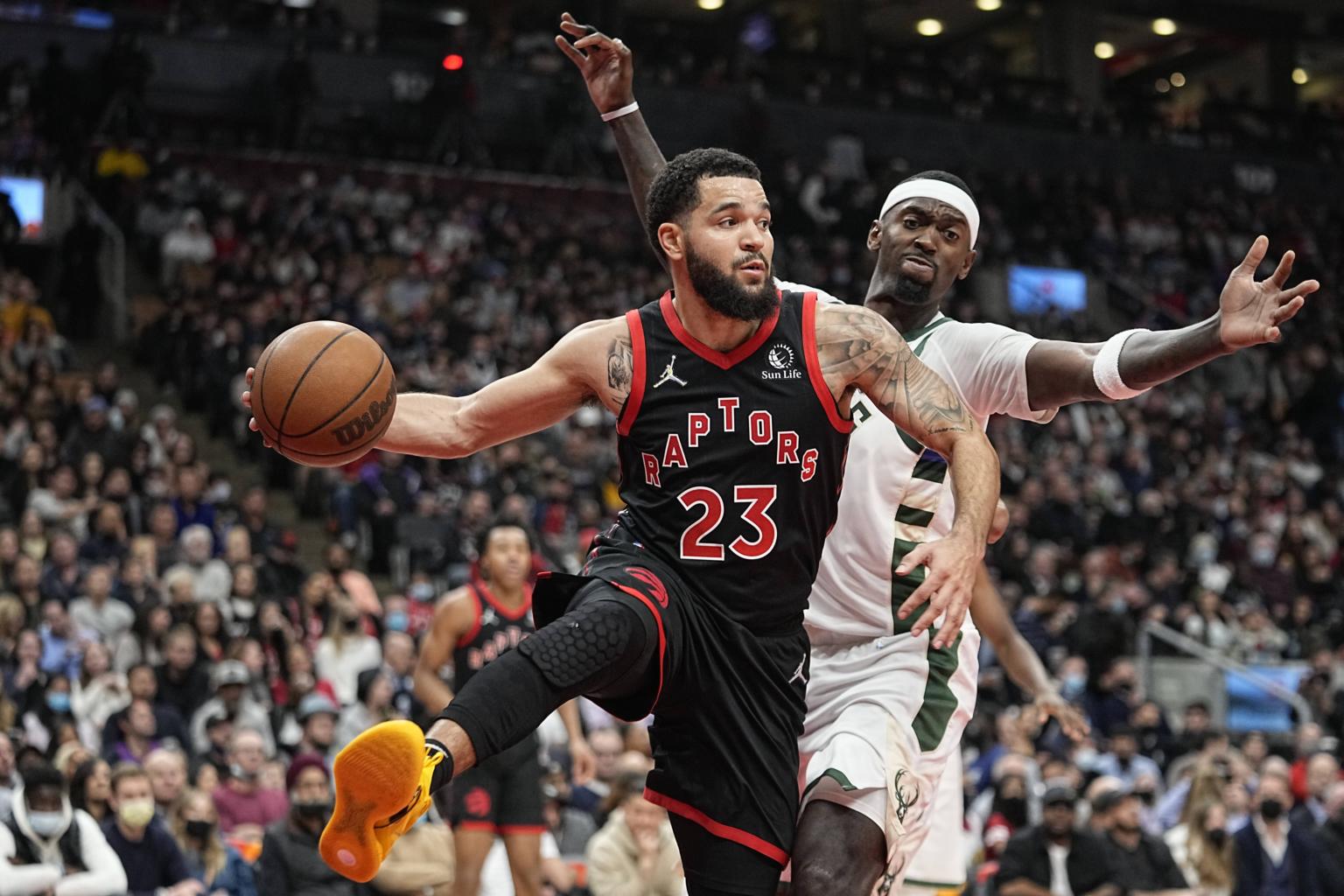 Fred VanVleet (left) scored 29 points as the Toronto Raptors halted the Milwaukee Bucks' winning streak with a 97-93 win in Toronto.