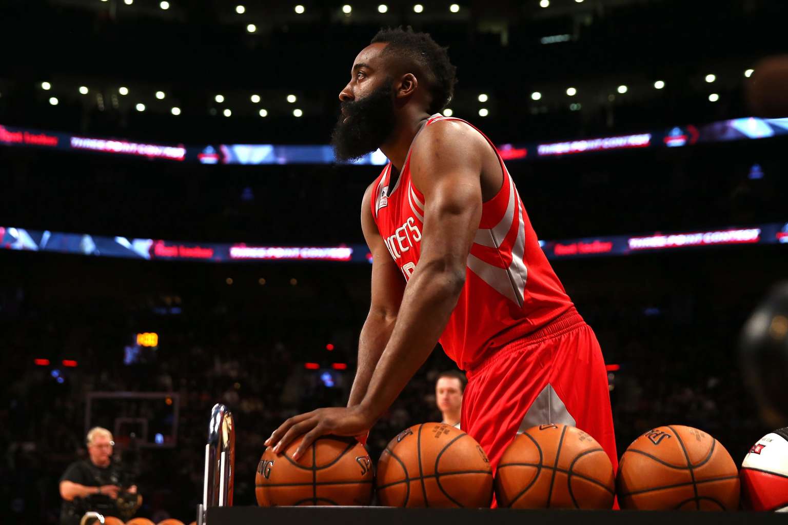 James Harden of the Houston Rockets shoots in the Foot Locker Three-Point Contest during NBA All-Star Weekend 2016 on Feb 13, 2016.