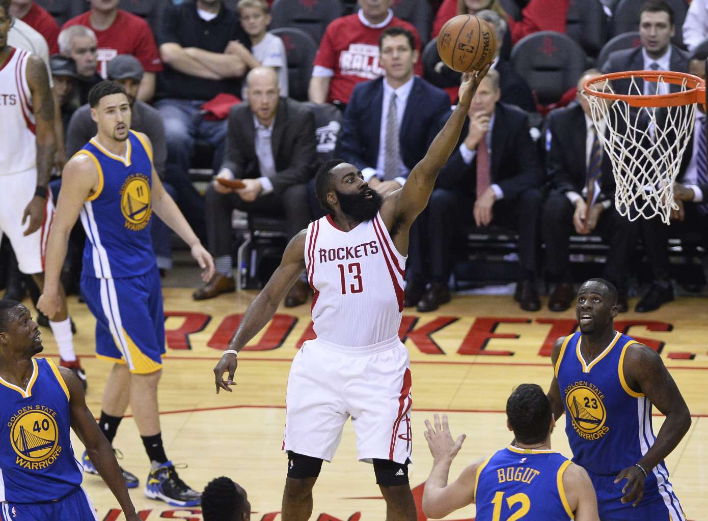 Houston Rockets player James Harden (centre) goes to the basket against the Golden State Warriors in the NBA Western Conference first round basketball game.
