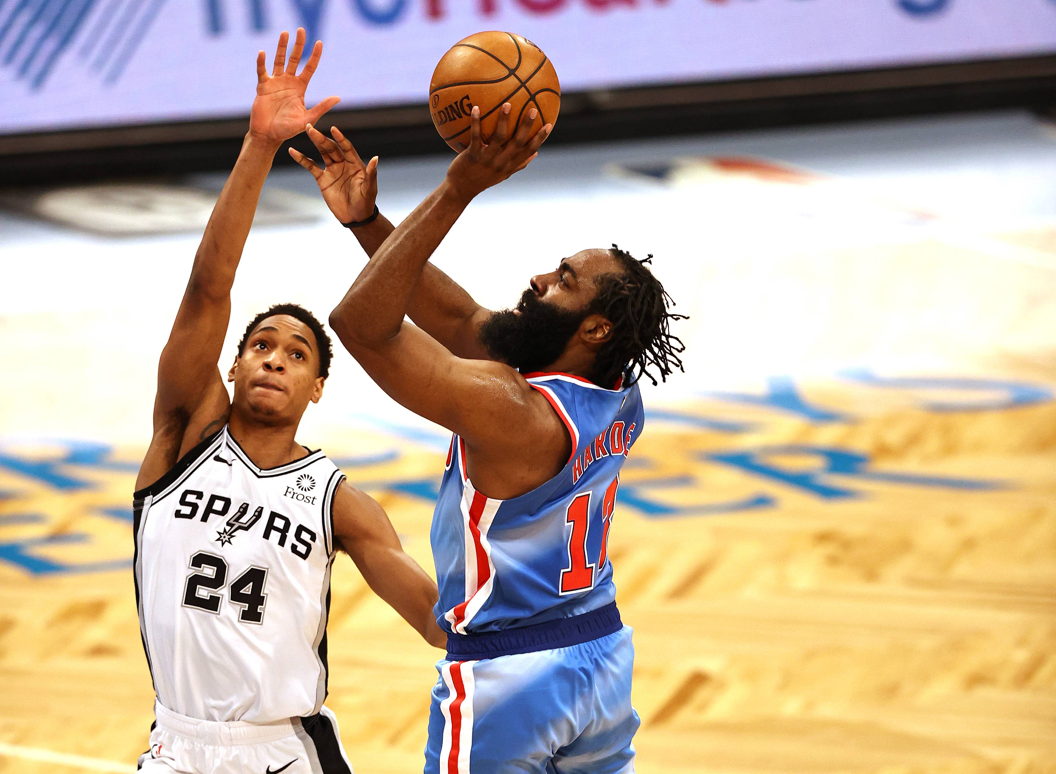 James Harden takes a shot as Devin Vassell (left) defends at Barclays Center, in Brooklyn, New York, on May 12, 2021.