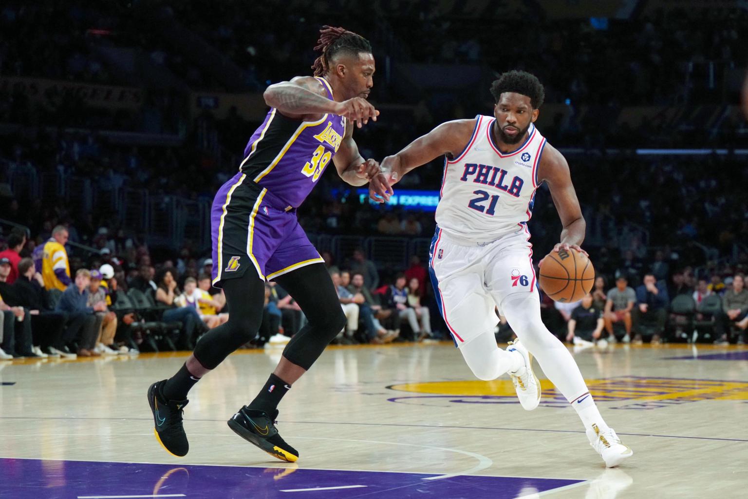 Philadelphia 76ers'Joel Embiid (right) against Los Angeles Lakers' Dwight Howard at Crypto.com Arena on March 23, 2022.