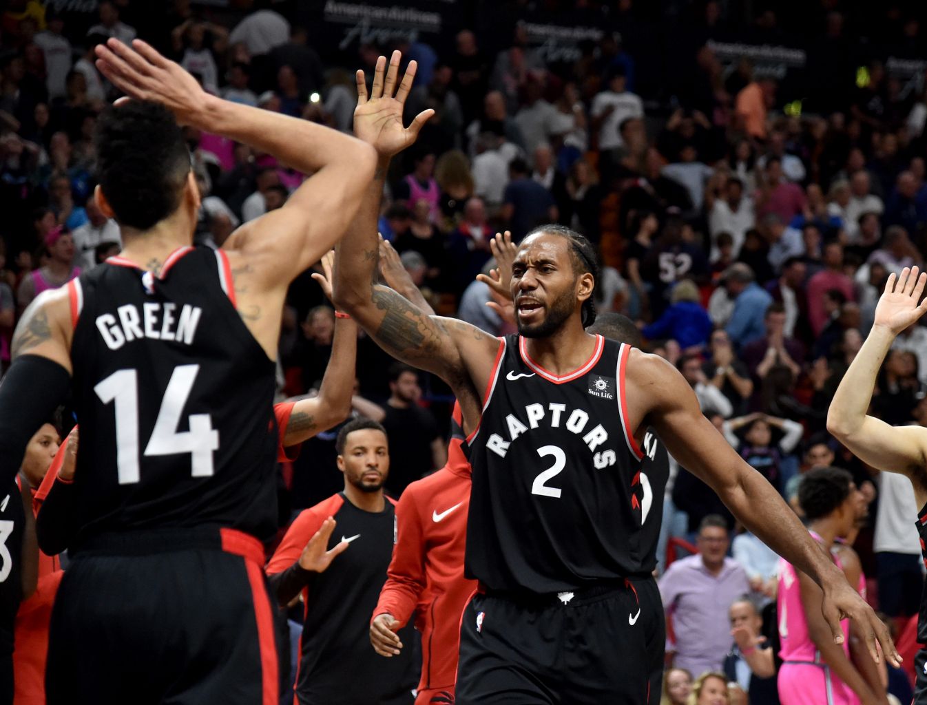 Toronto Raptors forward Kawhi Leonard (right) celebrates with guard Danny Green after defeating the Miami Heat at the American Airlines Arena on Dec 26, 2018.