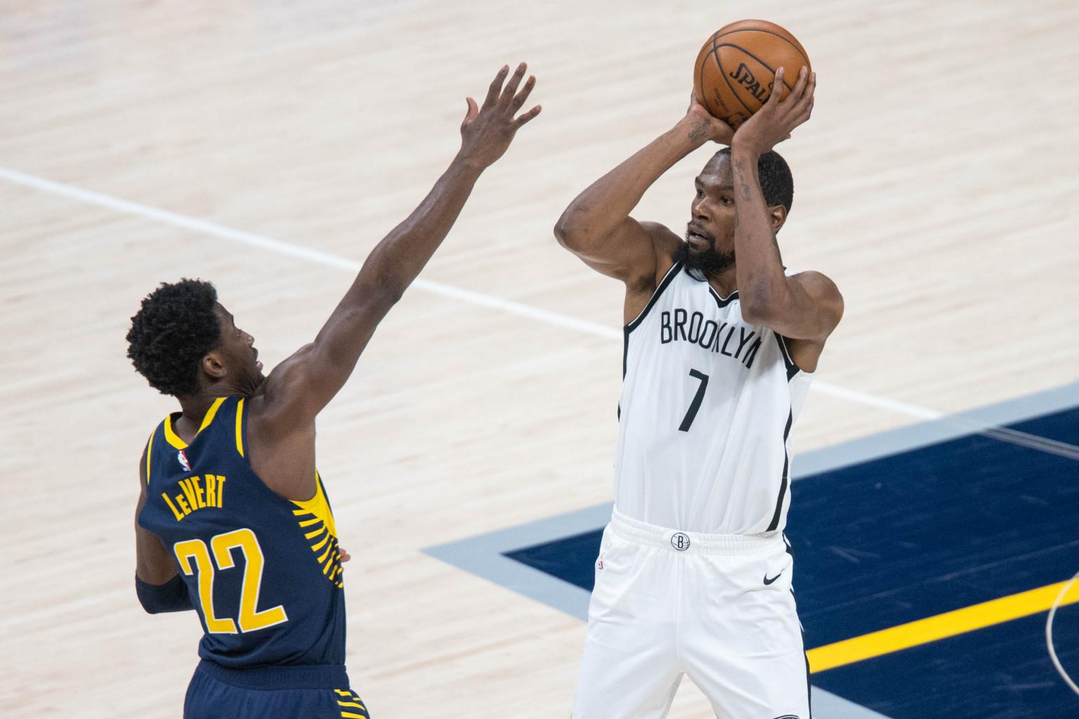 Kevin Durant shoots the ball while Caris LeVert defends in Indianapolis, US, on April 29, 2021.