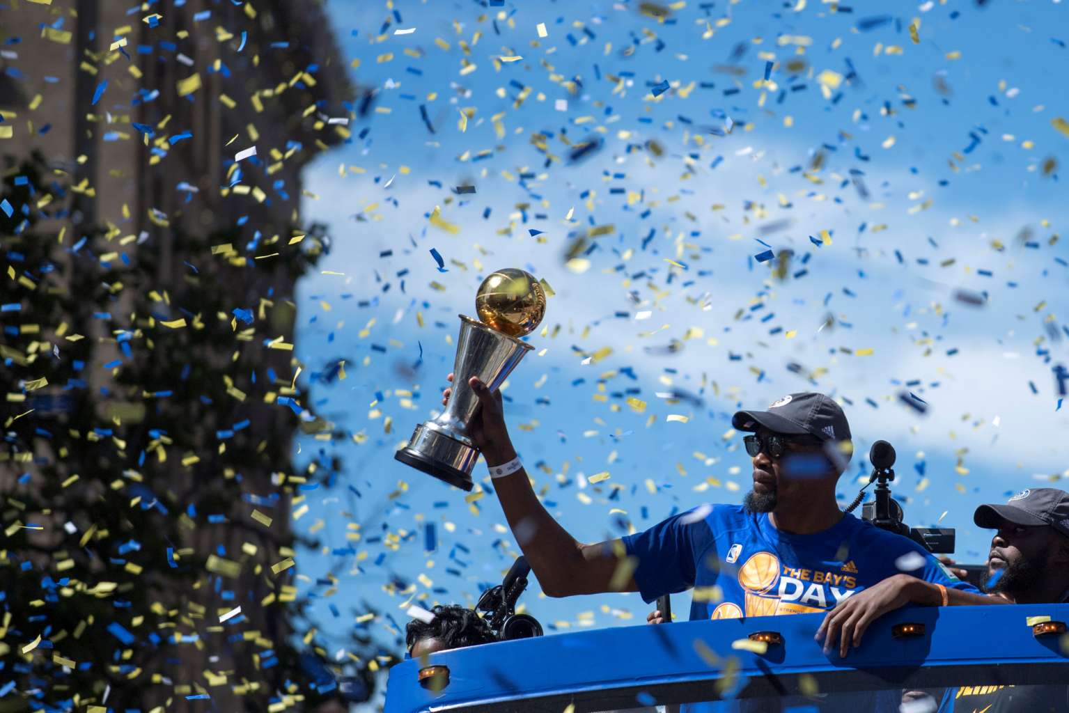 Golden State Warriors forward Kevin Durant hoisting the MVP trophy during the team's NBA championship victory parade in downtown Oakland, California on June 15, 2017.