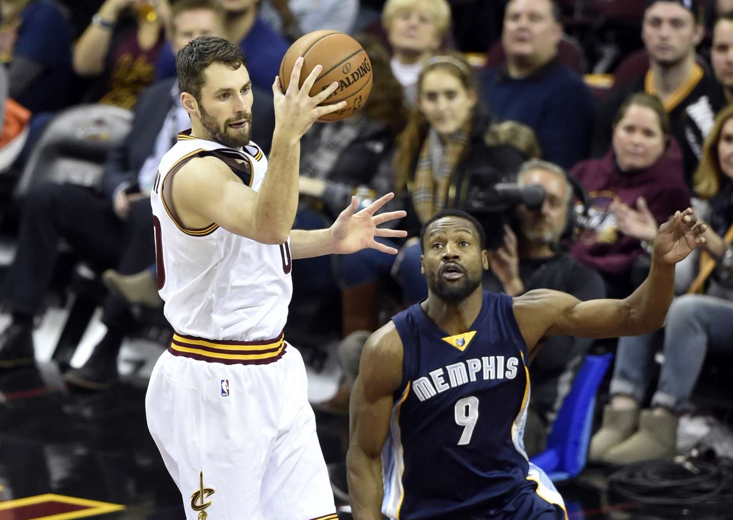 Cleveland Cavaliers forward Kevin Love (#0) rebounds the ball against Memphis Grizzlies guard Tony Allen (#9) during their NBA match on Dec 13, 2016.