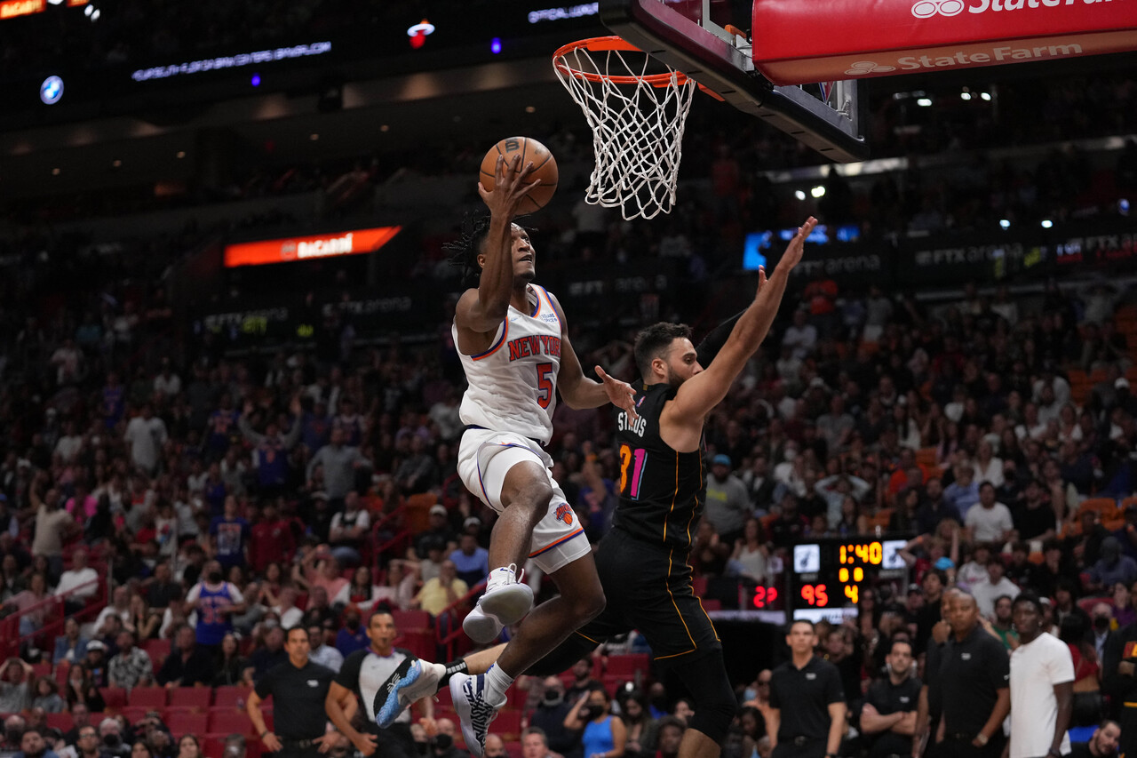 New York Knicks guard Immanuel Quickley (left) putting up a shot over Miami Heat guard Max Strus during their NBA match on March 25, 2022.