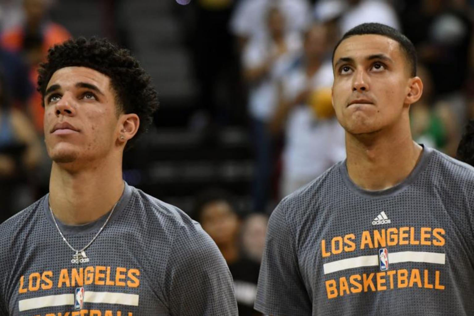 Lonzo Ball (left) #2 and Kyle Kuzma #0 of the Los Angeles Lakers stand on the court as the American national anthem is performed before the championship game of the 2017 Summer League against the Portland Trail Blazers at the Thomas & Mack Center on July 17, 2017 in Las Vegas, Nevada. Los Angeles won 110-98.