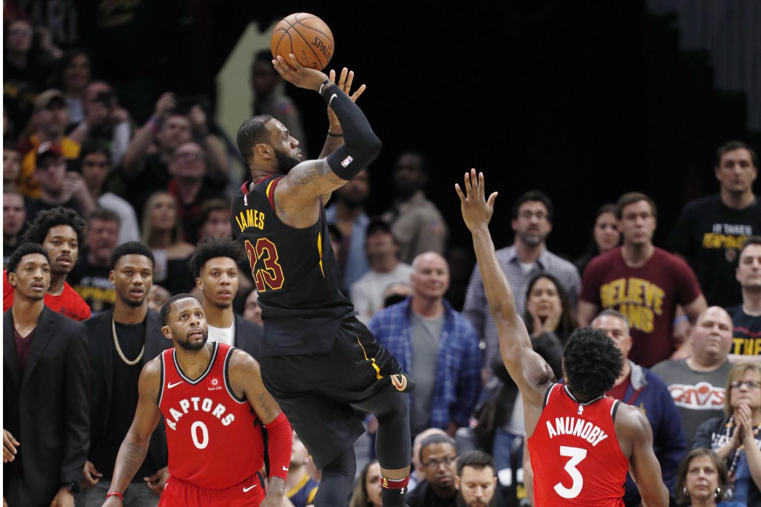 Cleveland Cavaliers forward LeBron James taking a shot over Toronto Raptors forward OG Anunoby (right) during their NBA playoffs match on May 5, 2018.