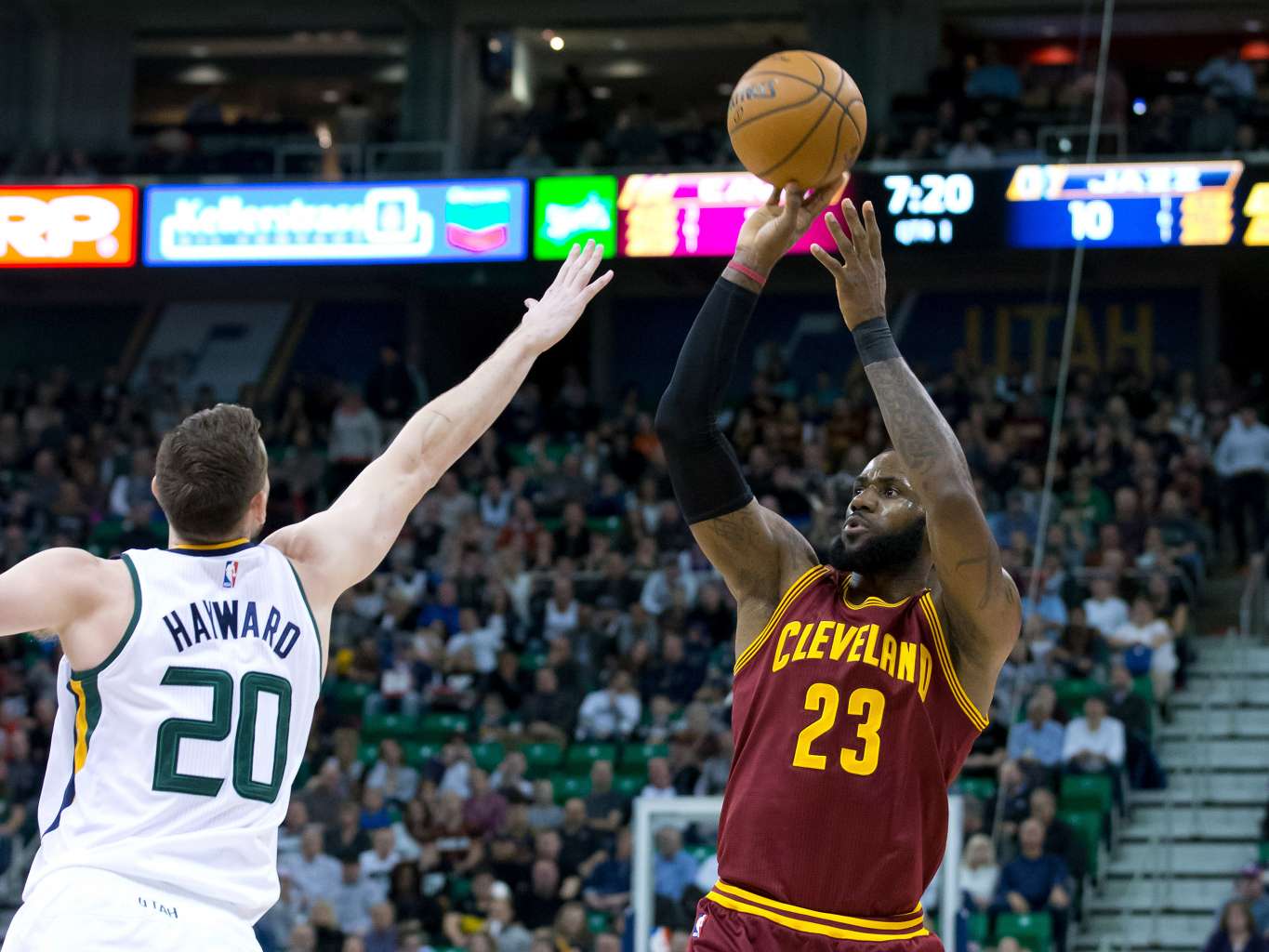 Cleveland Cavaliers forward LeBron James (#23) shooting the ball against Utah Jazz forward Gordon Hayward (#20) during their NBA match on Jan 10, 2017.