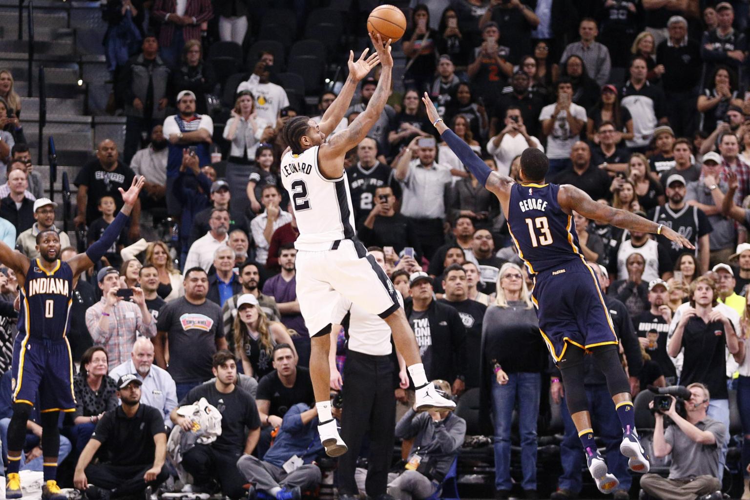 Leonard drained the shot despite being guarded by Pacers star Paul George.