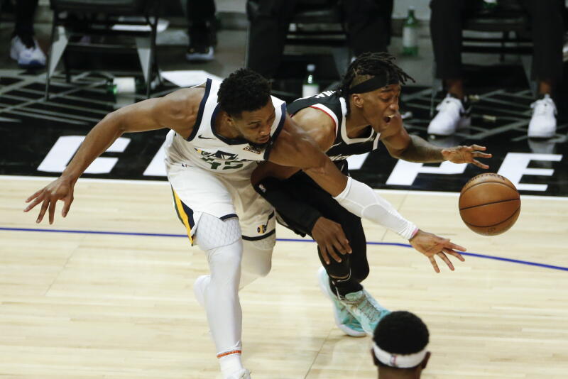 Utah Jazz guard Donovan Mitchell (left) and Los Angeles Clippers guard-forward Terance Mann fight for the ball on June 18, 2021.