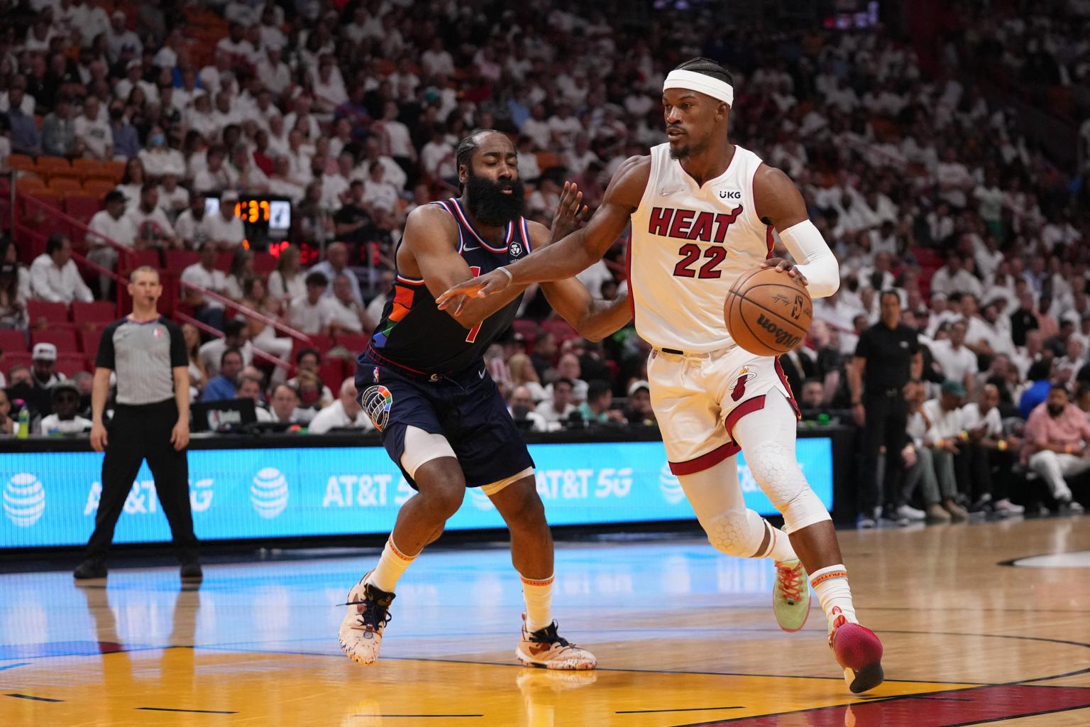 Jimmy Butler (right) drives the ball around James Harden 2022 NBA playoffs at FTX Arena in Florida on May 10, 2022.