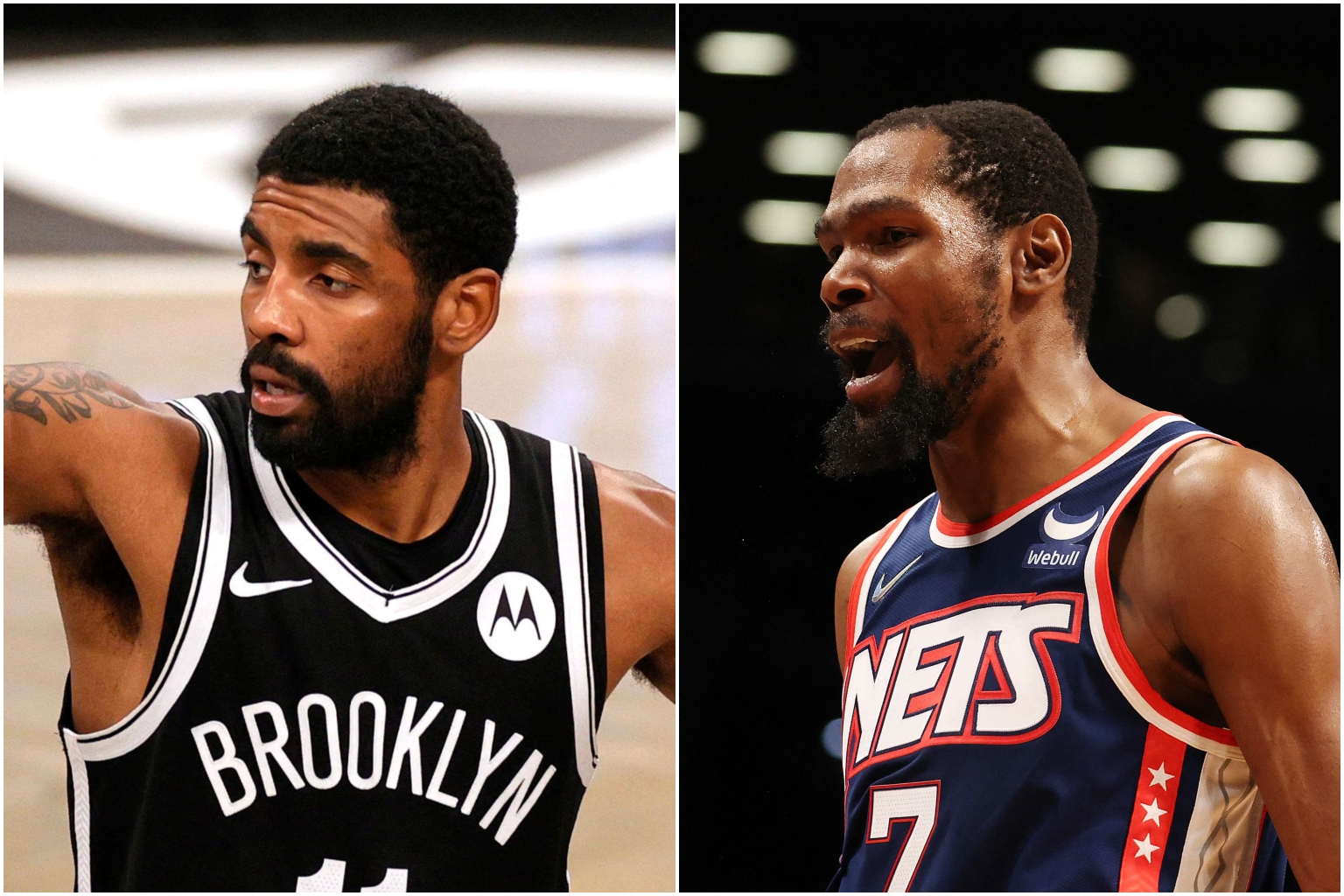 Kyrie Irving (left) and Kevin Durant join seven other Nets players who are on the NBA's Covid-19 protocols.