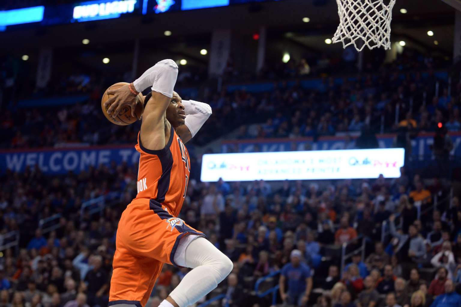 Oklahoma City Thunder guard Russell Westbrook going up for a dunk against the Boston Celtics, during their NBA game on Dec 11, 2016.