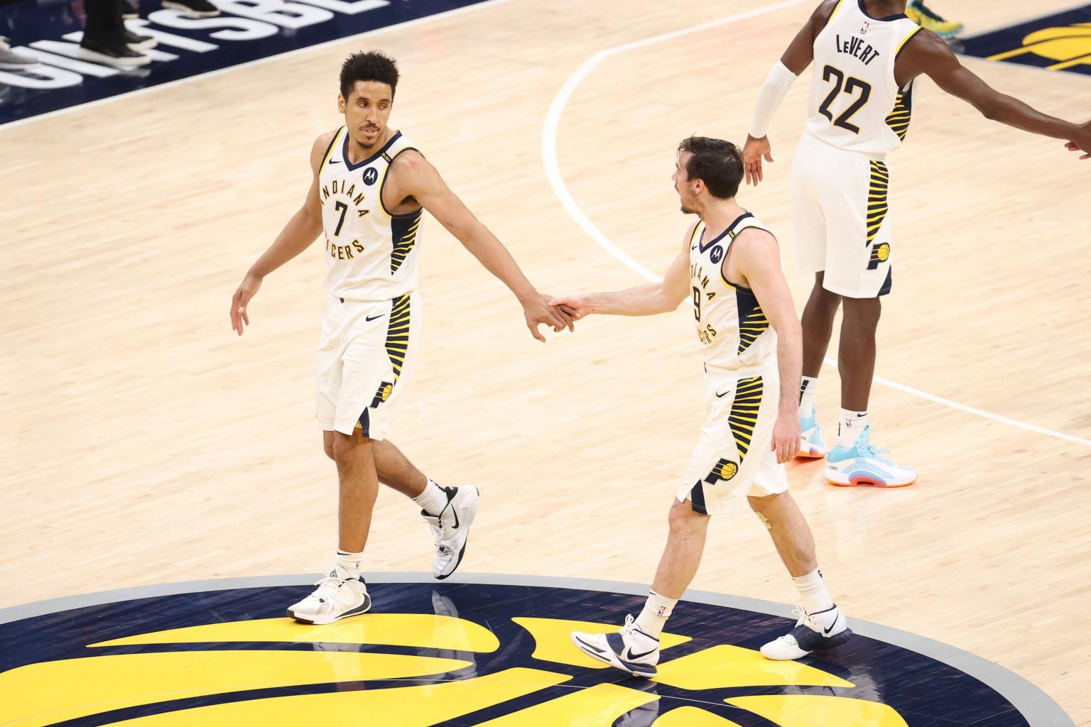 The Indiana Pacers celebrates during the win against the Oklahoma City Thunder in Indianapolis, Indiana, on April 21, 2021.