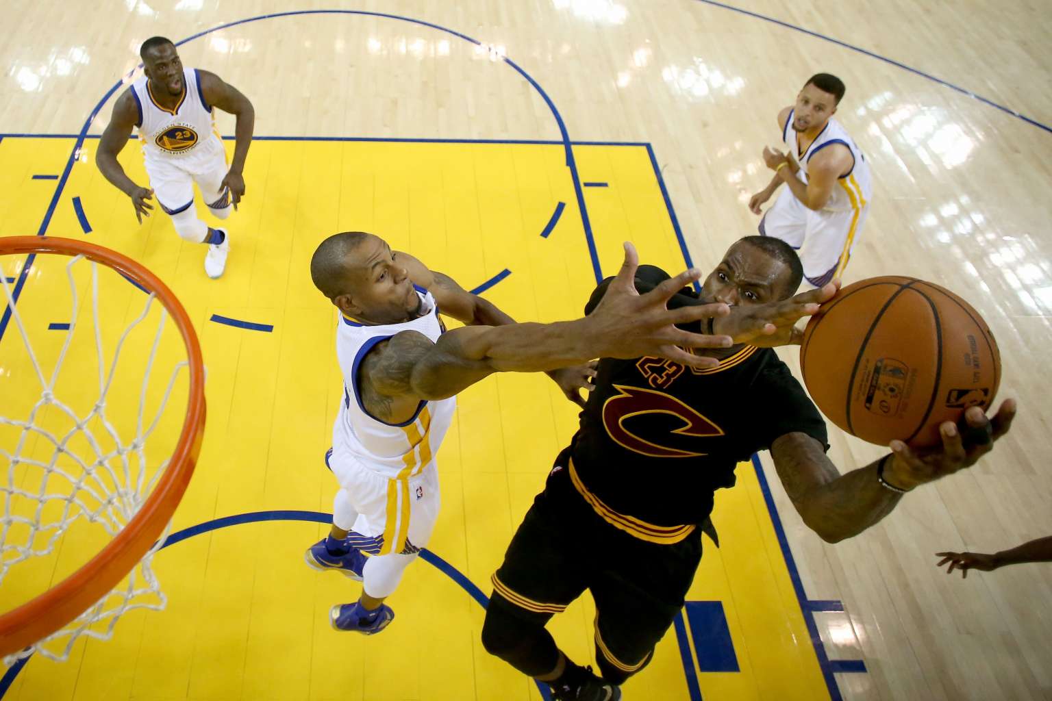 Andre Iguodala of the Golden State Warriors defends against LeBron James of the Cleveland Cavaliers in Game 7 of the 2016 NBA Finals at Oracle Arena on June 19, 2016 in Oakland, California.