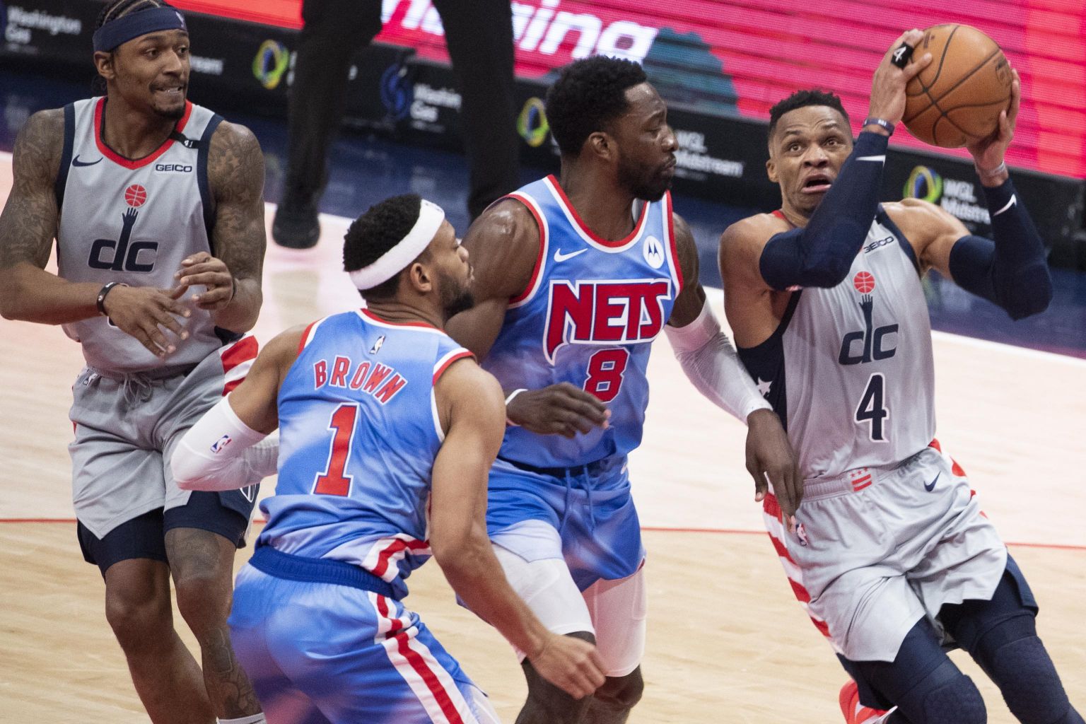The Nets took a 130-121 lead on Irving's three-pointer with 4:54 left but Washington was within 132-131 on Westbrook's three-point play with 2:41 left.