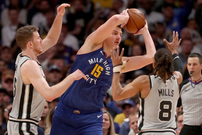 Denver Nuggets' Nikola Jokicis (centre) is guarded by Jakob Poeltl (#25) and Patty Mills (#8) of the San Antonio Spurs in the third quarter during Game Five of the first round of the 2019 NBA Western Conference Playoffs at the Pepsi Center on April 23, 2019.