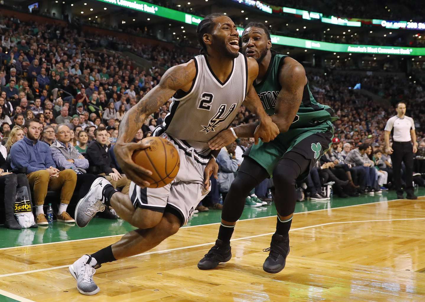 Kawhi Leonard drives past Boston Celtics forward Jae Crowder during the second half of the San Antonio Spurs 109-103 win over the Boston Celtics on Nov 26, 2016.