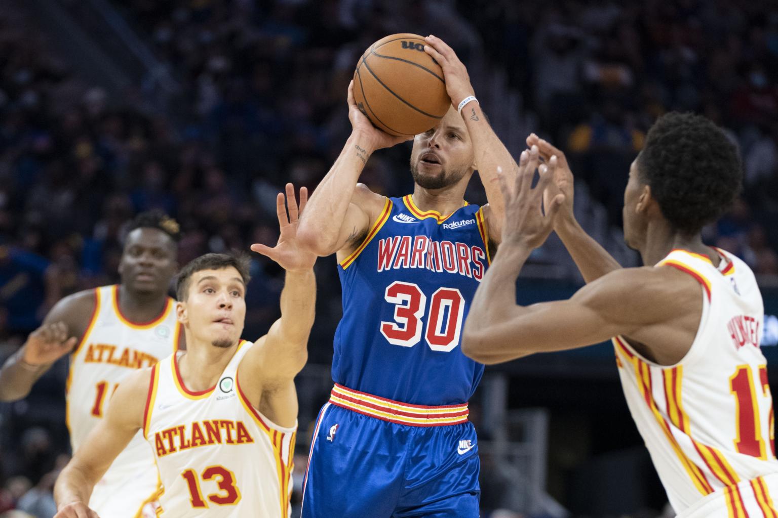 Stephen Curry (center) shoots the basketball against the Atlanta Hawks during the fourth quarter at Chase Center.
