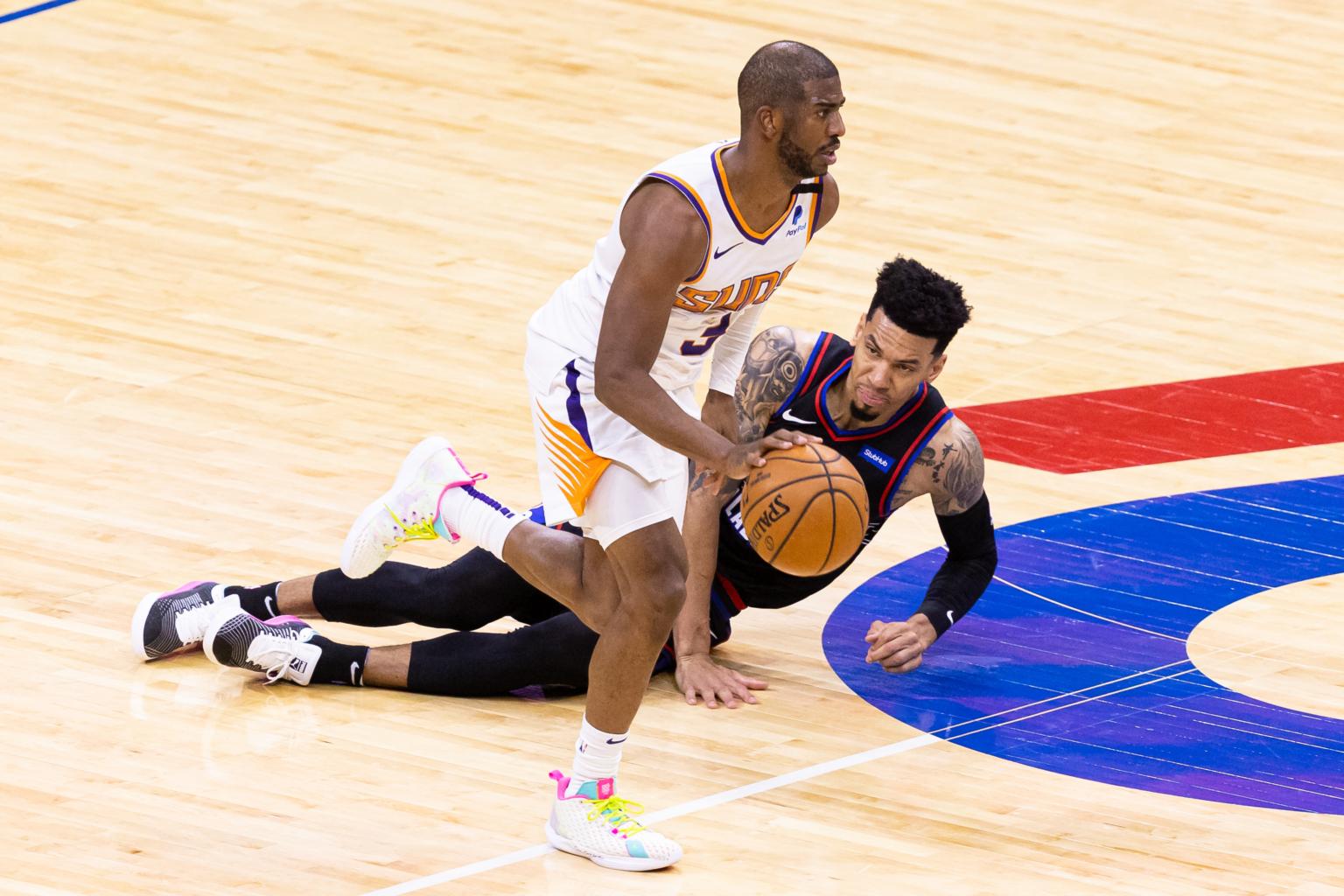 Chris Paul dribbles the ball as Danny Green falls to the floor in Philadelphia, US, on April 21, 2021.